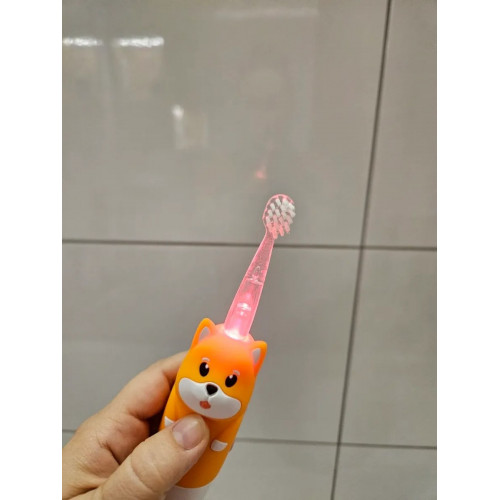 Щетка выглядит симпатично, удобно лежит в руке. Однако цвет отличается от фото на коробке, вживую оранжевый светлее. При первом нажатии включается подсветка, при повторном добавляется жужжание на трёх разных скоростях. Ребёнку год, не испугался, но пока чистить не согласился. Но тут нужно время привыкнуть, рассмотреть хорошенько) Будем надеяться, что щётка поможет решить проблему бунта при чистке зубов…